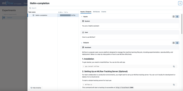 LiteLLM is often part of larger LLM applications, such as agentic models. MLflow Tracing allows you to instrument custom Python code, which can then be combined with LiteLLM traces.